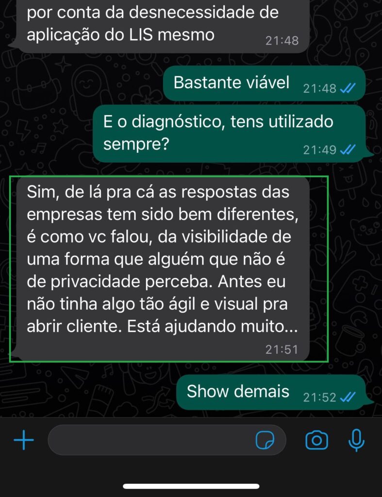 É excelente e vem me ajudando e facilitando muito o meu trabalho no diagnóstico exato da empresa.